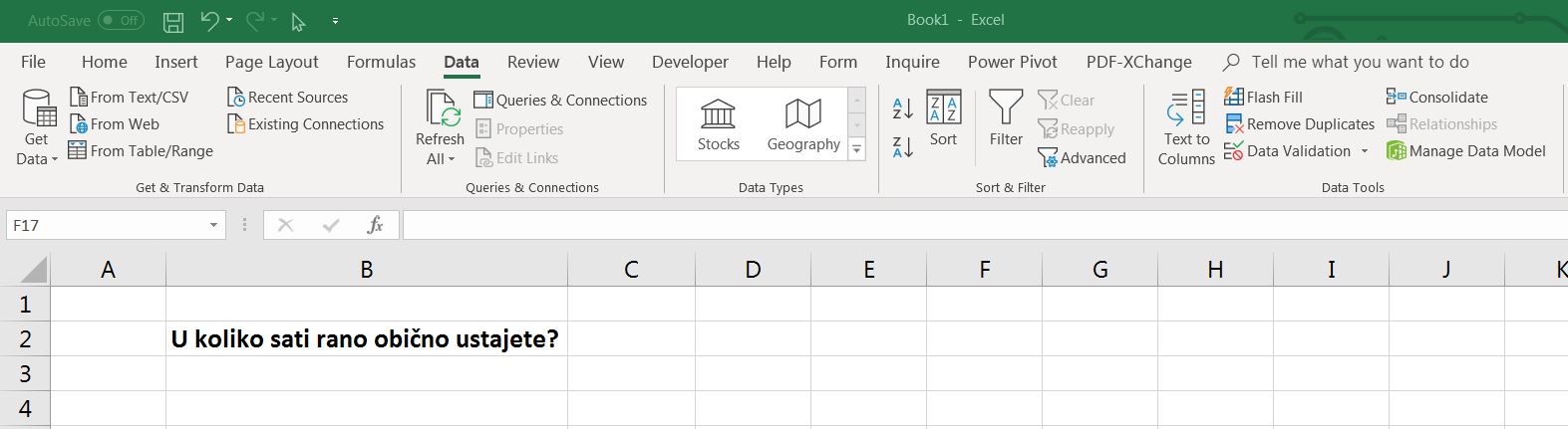 U ovom primeru ograničićemo korisnika da u ćeliju unese samo one vrednosti iz vama željenog opsega. Primer glasi: U koliko sati rano obično ustajete? (želimo da ograničimo unos na vremenski interval od 5h do 11h)