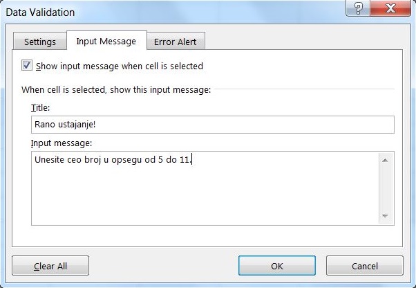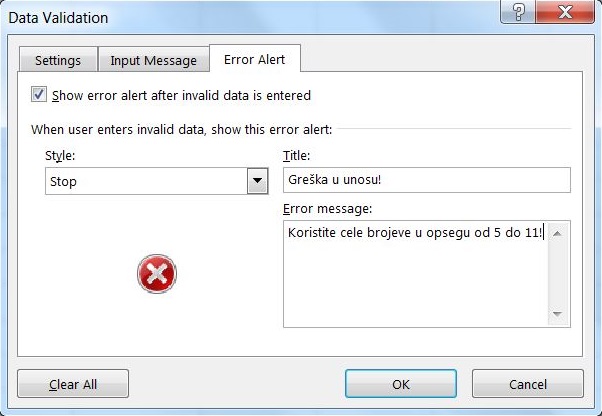 U slučaju da korisnik ne postupi u skladu sa uputstvom koji smo mu naveli u kartici Input Message i unese nevažeću vrednost ili vrednost van definisanog opsega, pojaviće se upozorenje o grešci. To upozorenje je moguće uskladiti našim potrebama koristeći Error Alert karticu na sledeći način: